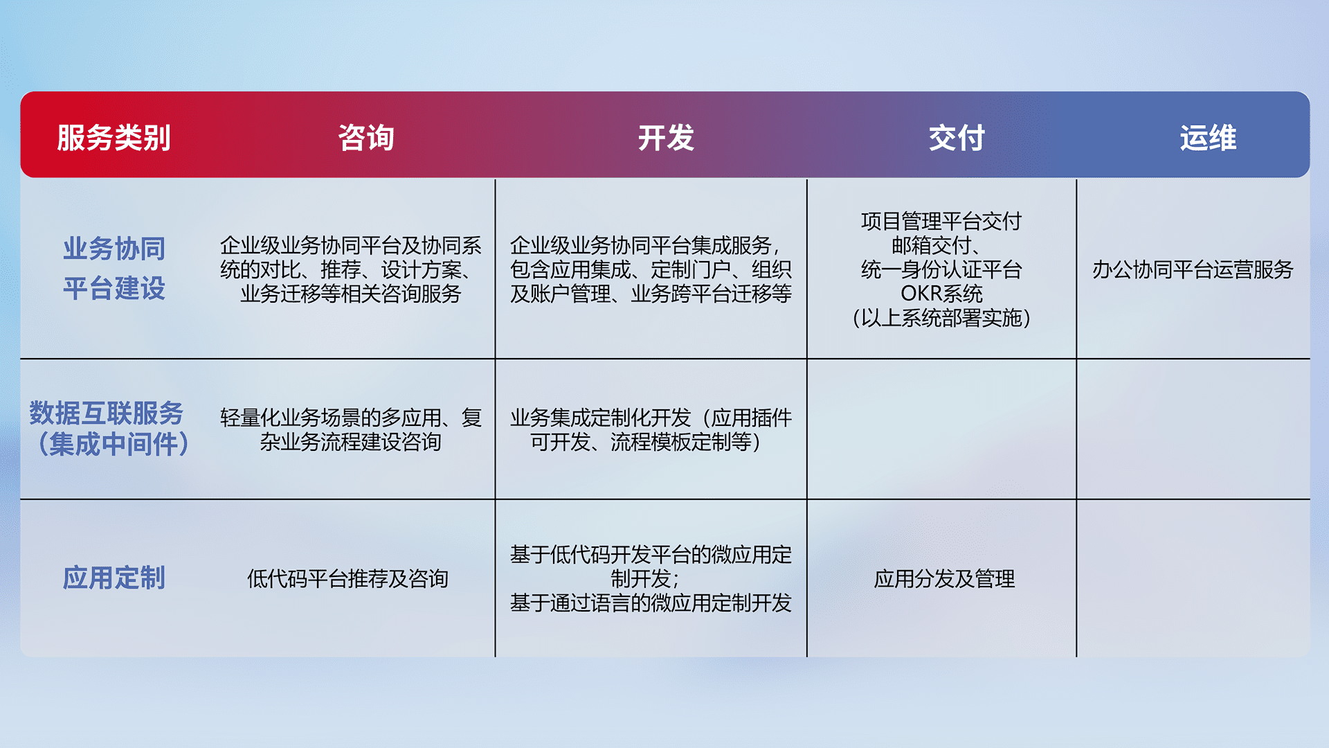 针对钉钉、、企微、、IDaas等平台级产品提供产品的规划、、、、方案、、交付、、、、定制化开发等服务,,,,实现如统一协同办公、、、、智能客户服务、、混合会议管理、、智能数据查询、、、、等业务场景,,,,实现数字化转型。。。。