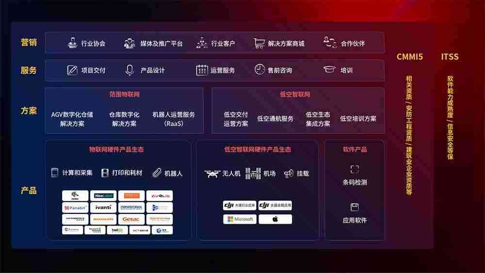 聚合国内外先进的物联网硬件产品品牌,,聚焦数字化仓储、、、机器人运营、、、低空智联网等领域,,共同打造适合客户业务场景的解决方案并提供交付服务